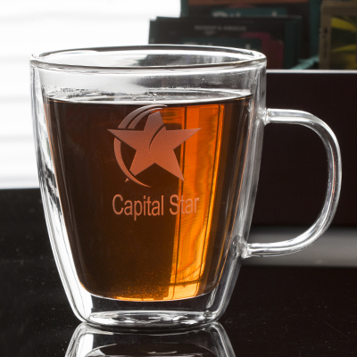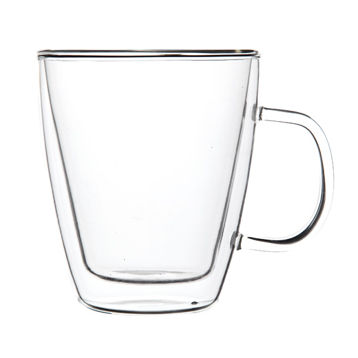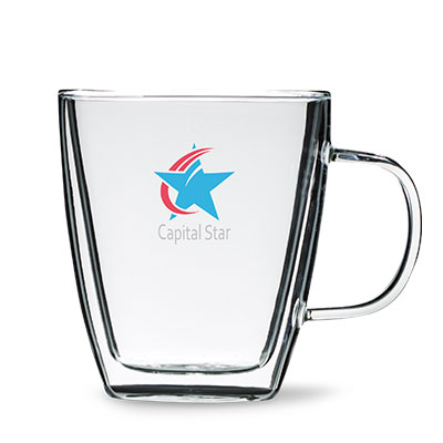 Obły kubek reklamowy wykonany z lekkiego szkła o podwójnych ściankach.